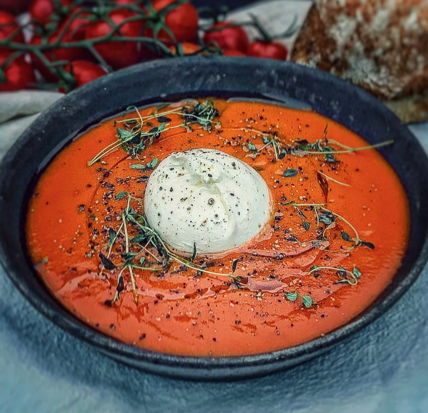 Tomatsoppa på färska tomater med burrata, olivolja och timjan